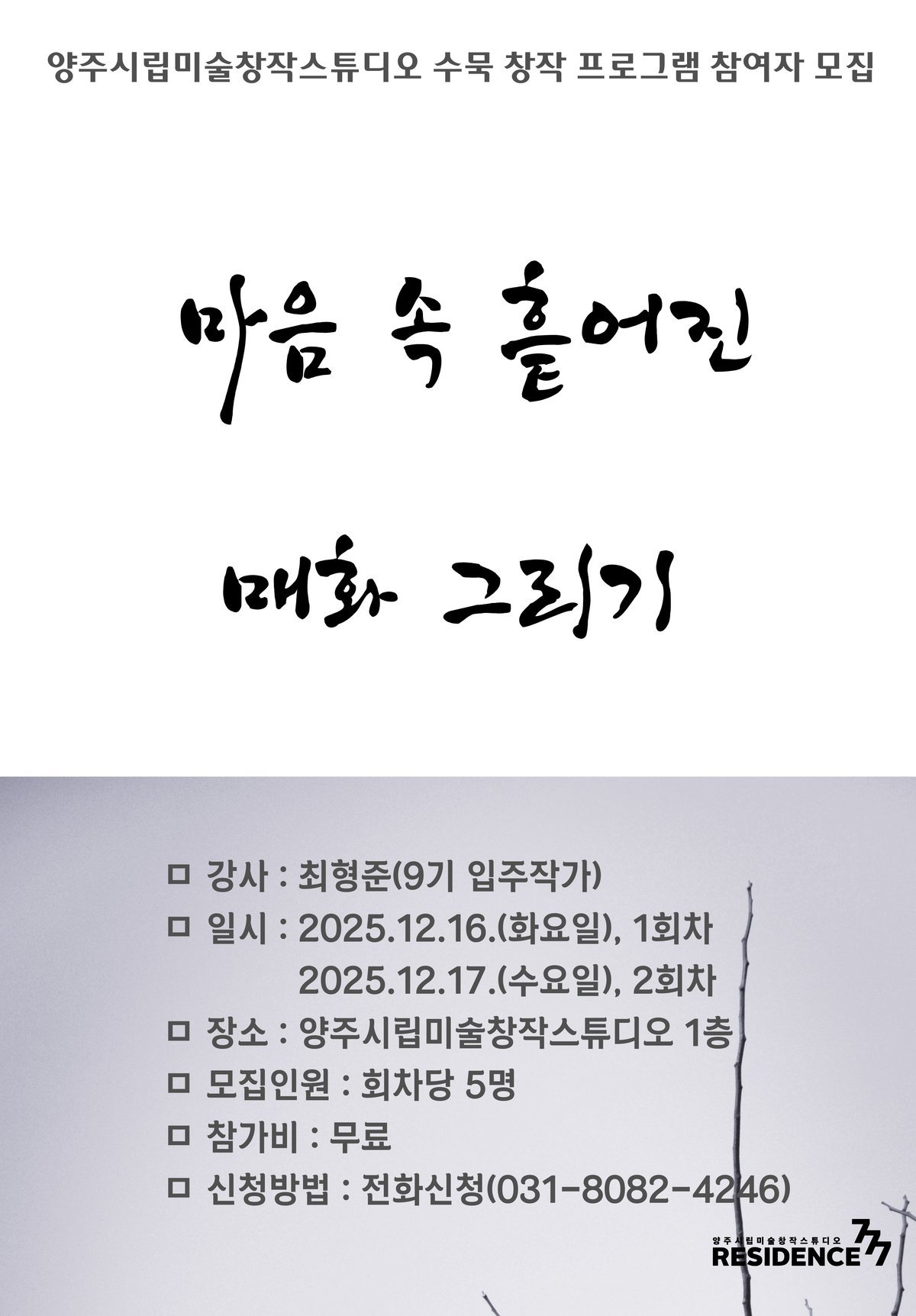 [금요저널] 양주시립미술관이 오는 12월 17일과 18일 이틀간, 양주시립미술창작스튜디오 9기 입주작가 최형준이 진행하는 창작 수묵화 프로그램 《마음 속 흩어진 매화 그리기》의 참여자를 모집한다.