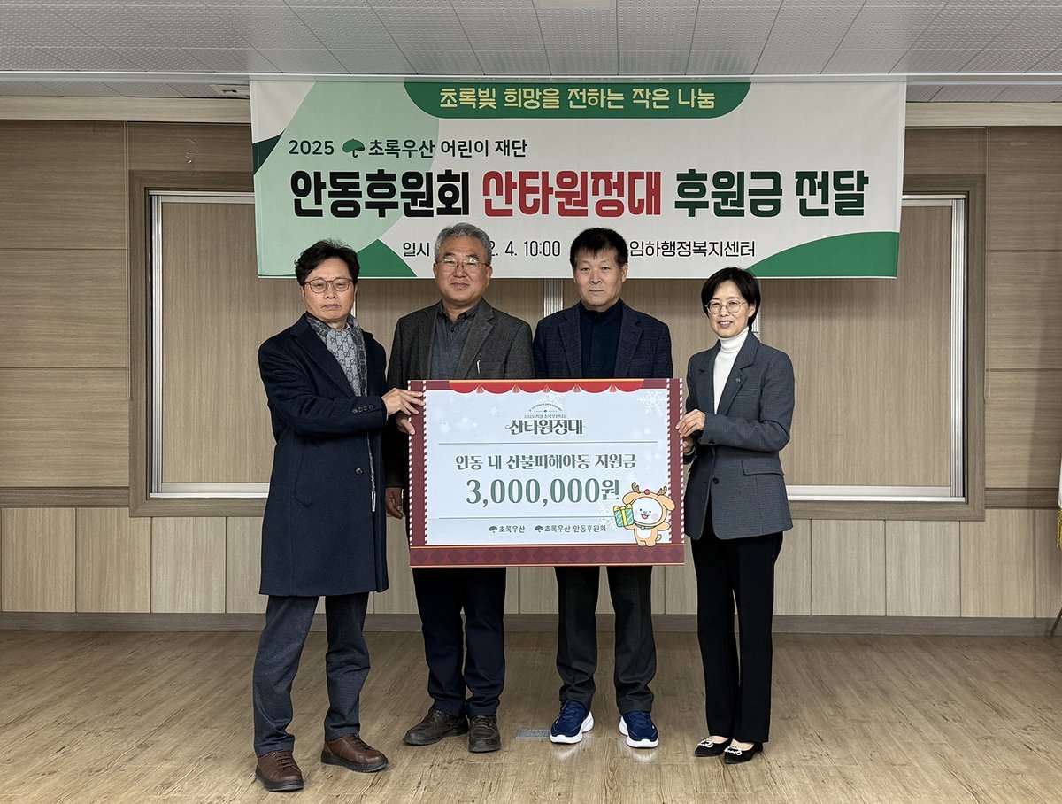 송정훈 임하면장은 “어려운 시기에 따뜻한 마음을 전해주신 초록우산 어린이재단 안동후원회에 깊은 감사를 드린다”며, “전해주신 지원금은 산불피해 아동들에게 큰 힘이 될 것”이라고 감사를 전했다.