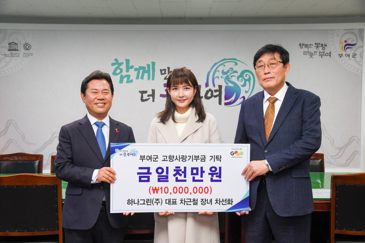 주 ) 하나그린 차근철 대표 장녀, 부여군 고향사랑기부제 1000만 원 기탁 - 부여군 출신 청년 사업가 차선화 씨, 고향에 전하는 따뜻한 응원 - (부여군 제공)