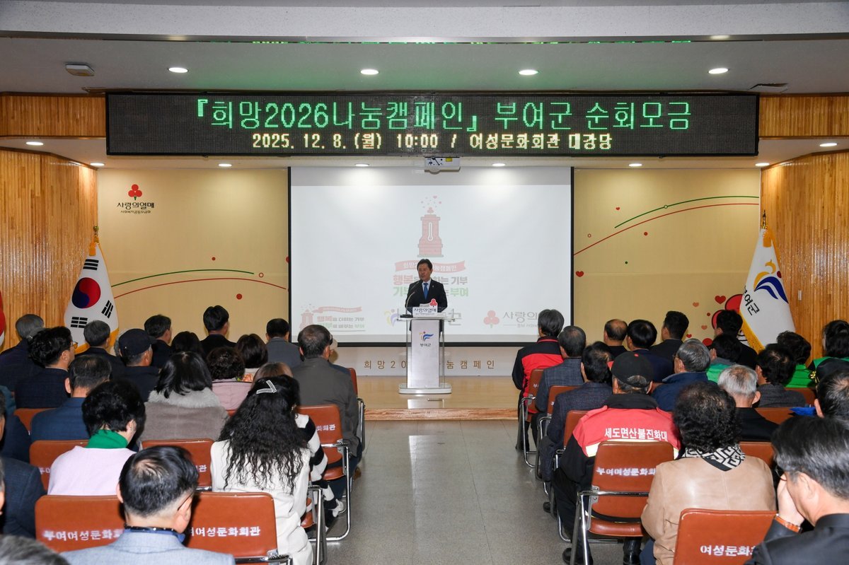 [금요저널] 부여군 은 ‘행복을 더하는 기부, 기부로 바꾸는 부여 ’라는 구호 아래 「 희망 2026 나눔 캠페인 」 순회 모금 행사를 지난 8일 여성문화회관 3층 대강당에서 개최했다.