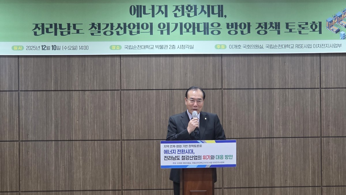 [금요저널] 이개호 국회의원실과 국립순천대학교는 10일 국립순천대 박물관 대회의실에서「에너지 전환시대, 전라남도 철강산업의 위기와 대응 방안」을 주제로 정책토론회를 공동 개최하고, 급변하는 산업환경 속에서 광양만권 철강산업이 나아가야 할 방향을 논의했다.