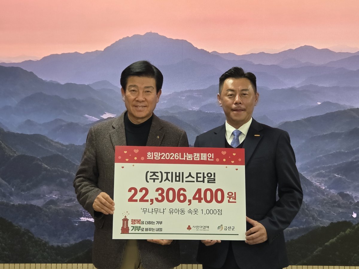 [금요저널] 유아동 의류 전문 브랜드 ㈜지비스타일은 지난 11일 금산군청을 방문해 약 2230만 원 상당 유아동 내의 1000점을 기탁하며 지역 아동을 위한 따뜻한 나눔을 실천했다.