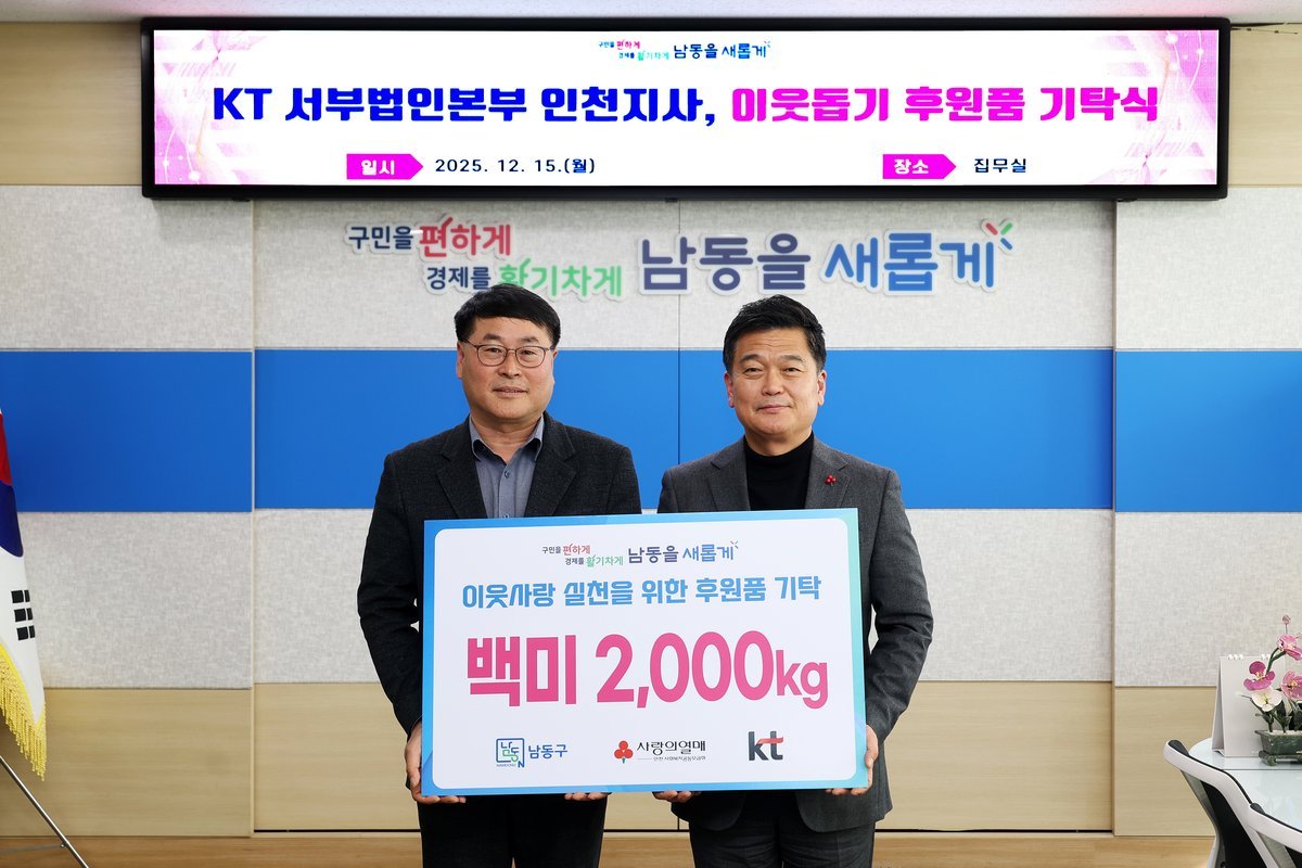 [금요저널] 인천시 남동구는 최근 KT 서부법인본부 인천지사로부터 취약계층을 위한 백미 10kg 200포를 기탁받았다고 17일 밝혔다.