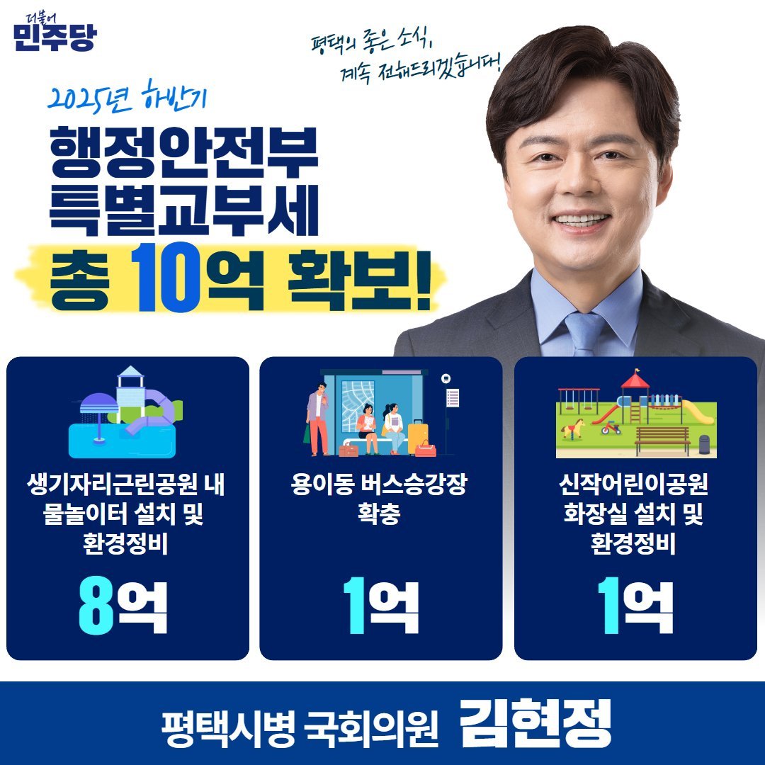 김현정 의원은 “이번 행정안전부 특별교부세 확보는 주민 불편 해소와 생활환경 개선이 시급한 현안을 중심으로 관계 부처와 지속적으로 협의한 결과”라며, “공원·교통·어린이 이용시설 등 주민 생활과 직결된 분야에 예산을 집중해 체감도 높은 변화를 만들어 가겠다”고 강조했다.