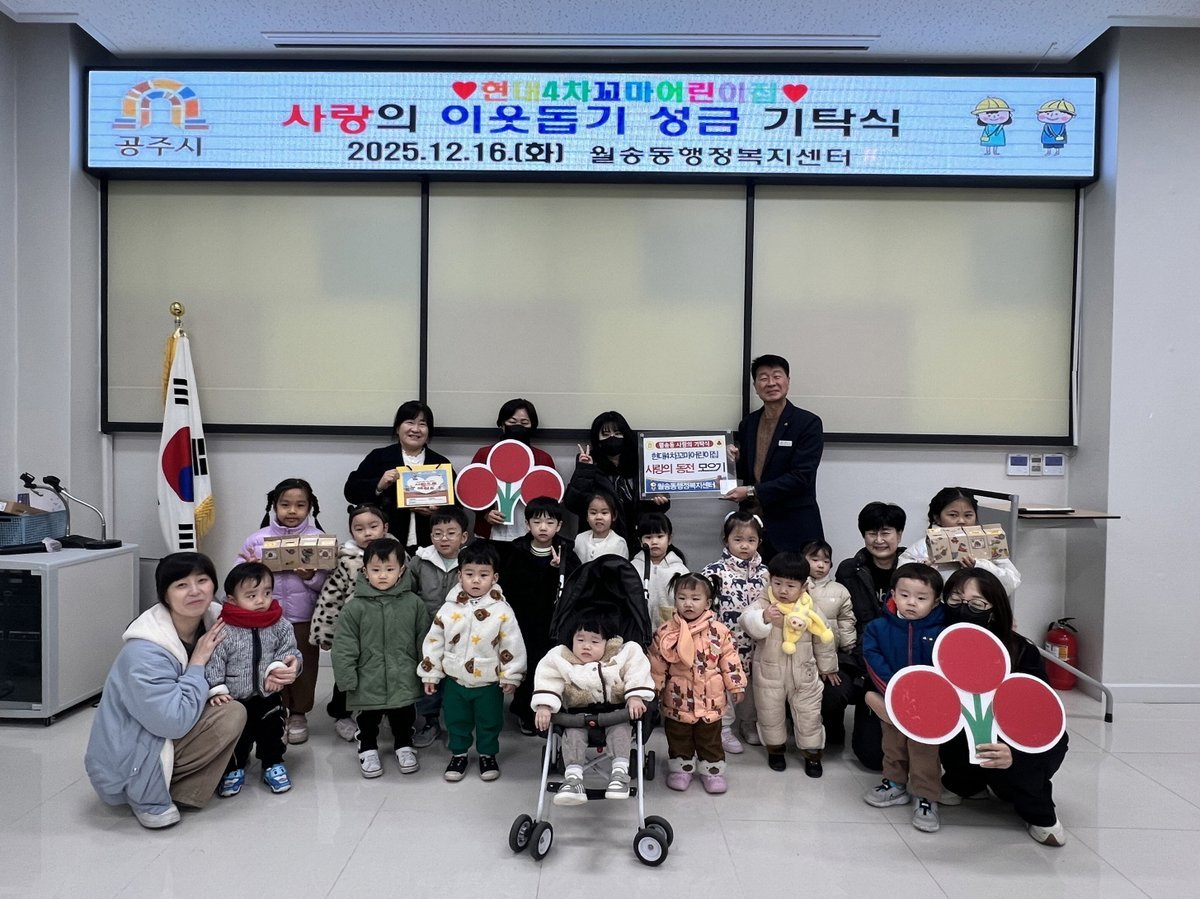 [금요저널] 공주시 월송동은 지난 16일 현대4차꼬마어린이집 원아와 교직원이 뜻을 모아 마련한 성금을 월송동 행정복지센터에 전달받았다고 밝혔다.