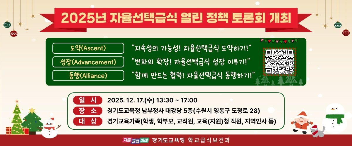 [금요저널] 경기도교육청이 자율선택급식 시행 4주년을 맞아 17일 남부청사 대강당에서 경기교육가족 200여 명이 참석한 가운데 ‘2025년 자율선택급식 열린 정책 토론회’를 개최했다.