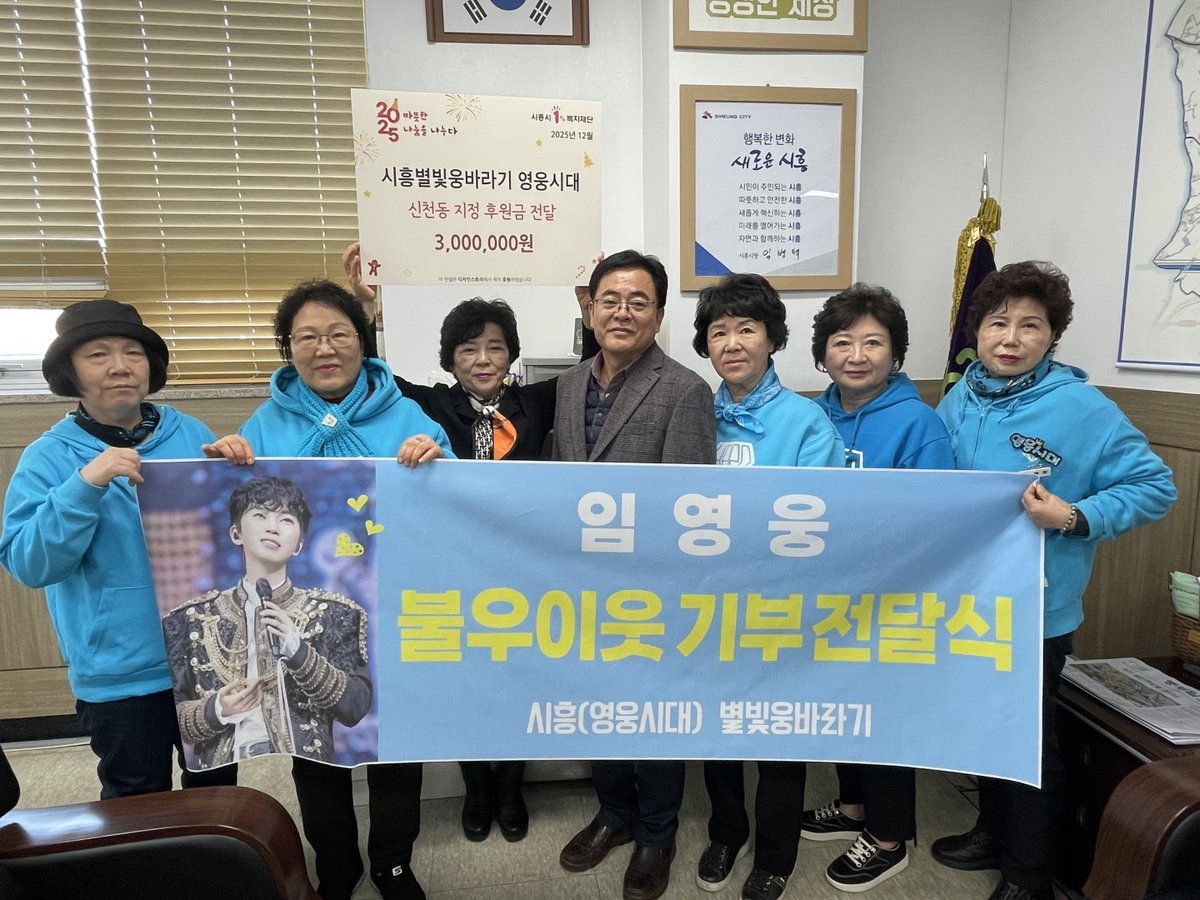 [금요저널] 시흥시 신천동 행정복지센터에 지난 12월 17일 트로트 가수 임영웅의 시흥 팬클럽인 ‘시흥별빛웅바라기 영웅시대’가 방문해 연말을 맞아 지역 저소득 취약계층의 겨울나기 지원을 위한 후원금 300만 원을 전달했다.