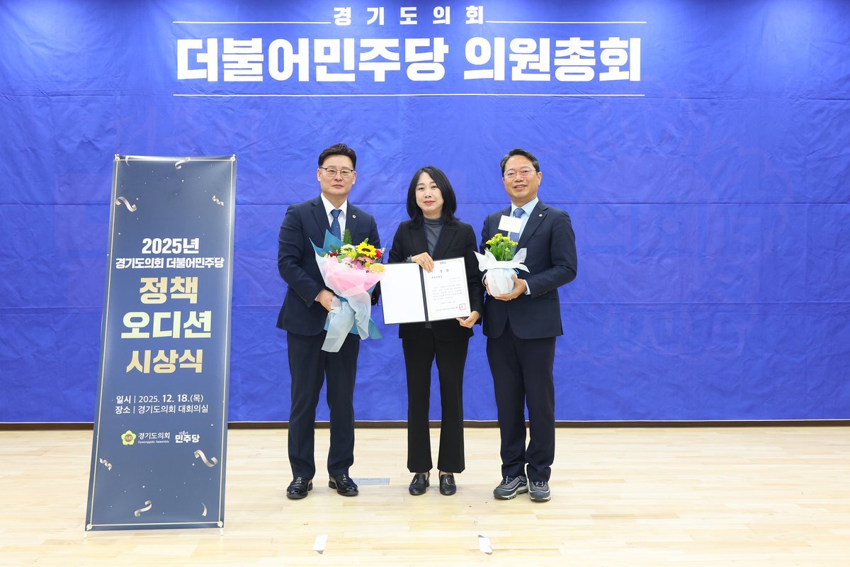 [금요저널] 경기도의회 경제노동위원회 이병숙 의원은 12월 18일 오전 도의회 대회의실에서 열린 「2025년 경기도의회 더불어민주당 정책오디션」에서 ‘경기도 여름 수변문화공원 어린이 문화예술 체험 활성화 방안’으로 대표의원상을 수상했다.