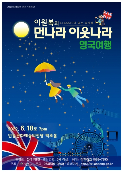 안동문화예술의전당 기획공연‘뮤지컬 이원복의 먼나라 이웃나라 – 영국여행’관람료는 전석 1만원으로 5세 이상 관람이 가능하다.