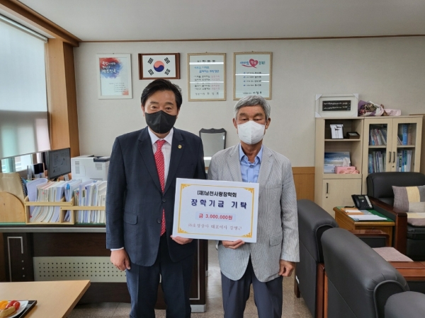 강영근 경산시 명예 남천면장은 13일 남천사랑장학회에 작년에 이어 올해도 장학금 3백만원을 기탁했다.