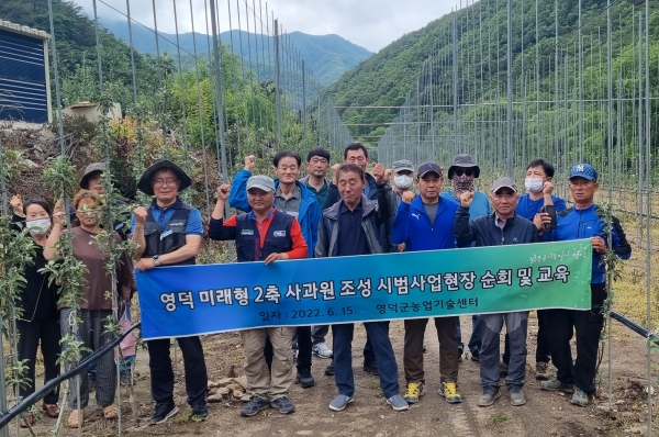 영덕군농업기술센터는 올해 처음으로 영덕 미래형 2축 사과원 시범사업을 시작해 지속적으로 보급할 예정으로 올해의 경우 시범사업을 9개소에 시행하고 각 시범사업 대상지를 방문해 2축 사과원 현황을 점검 및 교육하며 정보를 공유했다.