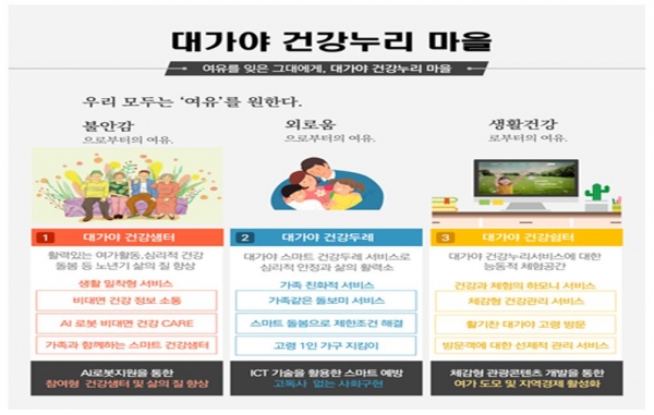고령군은 대가야읍을 중심으로 ‘대가야 건강누리 마을조성’ 이라는 과제로 공모에 참여했으며 총 사업비 10억원으로 대가야 건강샘터 서비스, 건강두레 서비스, 건강쉼터 서비스 등 3개 분야의 서비스를 제공한다.