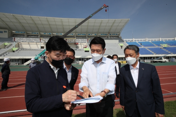 시는 완벽한 경기운영을 위해 국도비 80억원 등 총 사업비 245억원을 투입해 종합운동장 내·외부 도색 및 방수, 전광판 및 관람석 교체설치, 사무실 및 화장실 개·보수, 본부석 캐노피·창호·사무실·화장실 등 시설개선, 성화대 교체, 경기 용기구 설치 등 전면 리모델링 사업을 마무리 중에 있으며 6월말 완료할 예정이다.