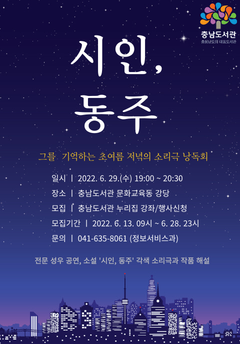 [금요저널] 충남도서관은 6월 호국보훈의 달을 맞아 오는 29일 도서관 문화교육동 강당에서 저항시인 윤동주를 기념하는 ‘시인, 동주’ 소리극 낭독회를 개최한다고 20일 밝혔다.