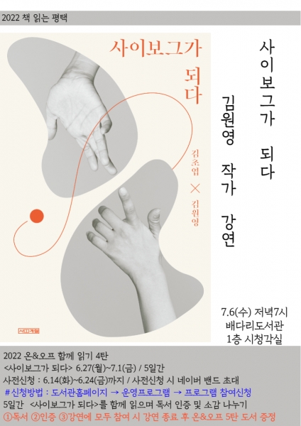 [금요저널] 2022년 평택시 시민독서운동 ‘책 읽는 평택’ 사업의 네 번째 저자 강연이 배다리도서관에서 오는 7월 6일 저녁 7시에 열린다.