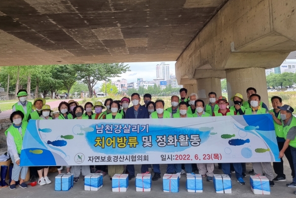 [금요저널] 경산시자연보호협의회는 23일에 경산의 대표 하천인 남천강 살리기 운동의 일환으로 생태하천 복원을 위한 미꾸라지 1만 5천여 마리 방류 및 남천강변 정화 활동을 했다.