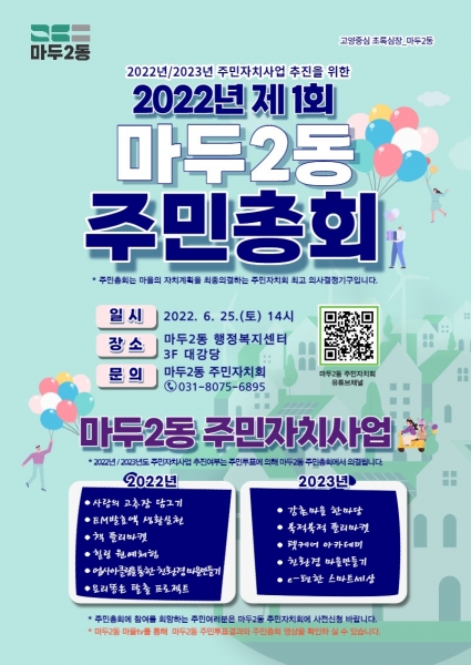 마두2동 주민자치회는 2022년 마을사업 6개와 2023년 마을사업 5개를 제안했고 이번 2022년 주민총회에서는 총 11개 사업에 대해 각각 찬반 투표를 해 마을사업 시행 여부를 결정하게 된다.