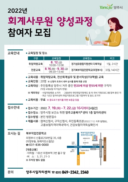 [금요저널] 양주시는 오는 7월 19일부터 2022년 취업지원프로그램‘회계사무원 양성과정’에 참여할 교육생을 모집한다.