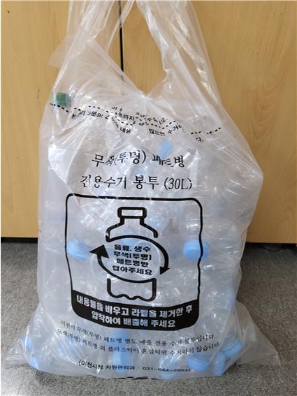 투명페트병 전용봉투에는 무색 투명페트병 외에 유색 페트병 및 일반 플라스틱은 함께 담으면 안 되며 홍보용으로 제작된 것으로 소진 시에는 투명 또는 반투명 봉투에 담아 배출하면 된다.