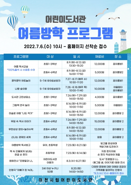 어린이도서관 여름방학 프로그램은 7월 6일 수요일 10시부터 이천시통합도서관 홈페이지를 통해 선착순으로 접수 후 참여할 수 있다.