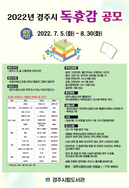 [금요저널] 경주시는 시민의 독서 의욕을 고취하고 책 읽는 분위기 확산을 위해 ‘2022년 경주시 독후감 공모’를 주최한다고 27일 밝혔다.