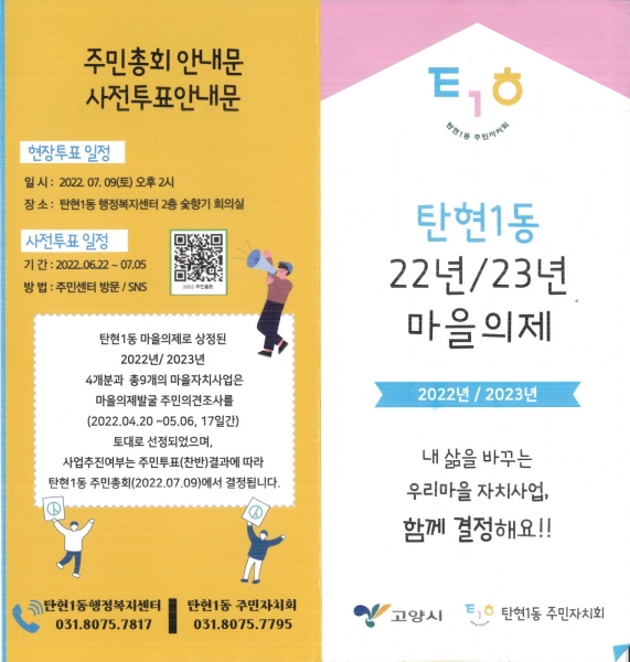 [금요저널] 고양시 탄현1동 행정복지센터에서는 2022년 탄현1동 주민자치사업의 원활한 추진을 위한 ‘주민총회 사전투표’를 온라인 및 오프라인으로 진행한다고 밝혔다.