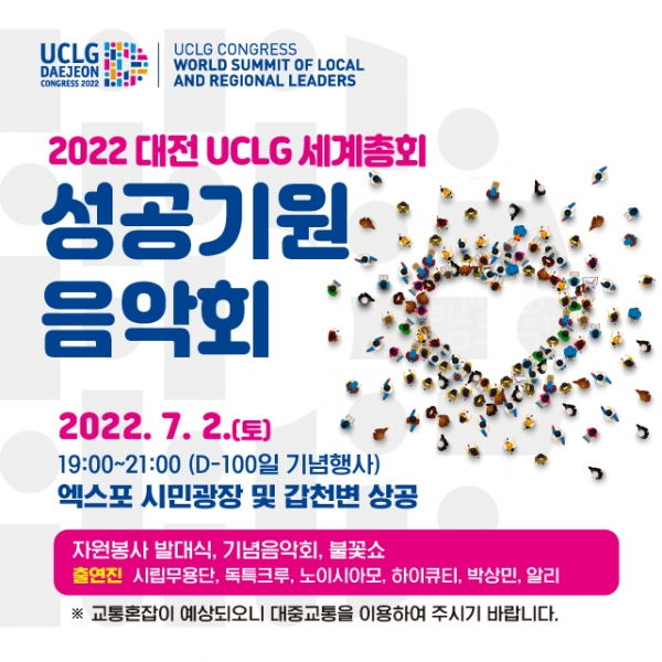 조직위는 ‘2022 대전 UCLG 세계총회’가 100일 앞으로 다가왔다며 시민과 함께하는 성공기원 음악회를 7월 2일 19시 엑스포시민광장에서 개최한다고 밝혔다.