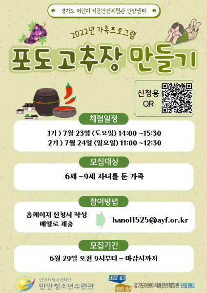 포도고추장 만들기는 7월 23일 ~ 24일 이틀간 만안청소년수련관 3층 자연초롱 교실에서 진행되며 참여를 원하는 가족은 29일부터 어린이 식품안전체험관 안양센터 홈페이지를 통해서 신청할 수 있다.