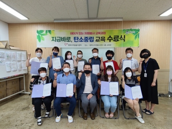 [금요저널] 평택시자원봉사센터는 자원봉사자 24명을 대상으로 테마가 있는 자원봉사 교육 ‘지금 바로 탄소중립’ 과정을 운영하고 지난 28일 수료식을 가졌다.