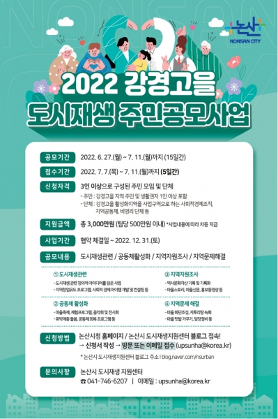 시 관계자는 “이번 주민공모사업을 통해 강경고을 도시재생사업에 대한 주민의 이해와 참여를 높이고 지역에 활기를 불어넣을 수 있는 계기를 마련해 지속가능한 도시재생사업이 추진될 수 있도록 하겠다”며 시민들의 많은 관심과 참여를 당부했다.