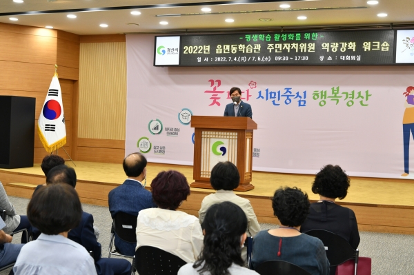 [금요저널] 경산시는 4일과 6일 2일간 시청 대회의실에서 시장, 주민자치위원 등 관계자 40여명이 참석한 가운데 시민이 디자인하는 평생학습 활성화를 위해 ‘2022년 읍면동학습관 주민자치위원 역량강화 워크숍’을 진행한다고 밝혔다.