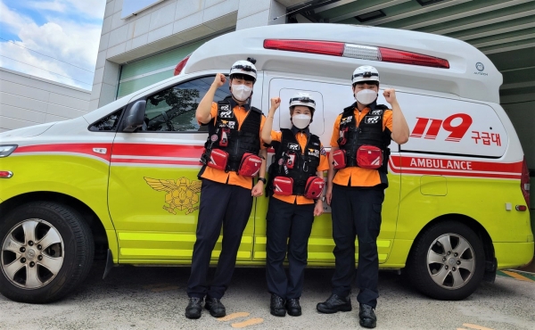 구미소방서 옥계119안전센터 구급대원 3명은 즉시 출동해 임산부 상태를 확인하고 평소 진료를 받던 대구 소재 산부인과로 출발했다.