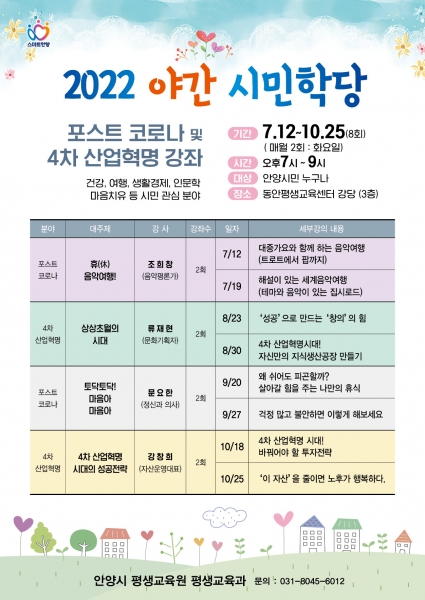 안양시가 이달부터 10월까지 밤 시간대로 진행하는 2022 안양시민학당 프로그램을 5일 공개했다.