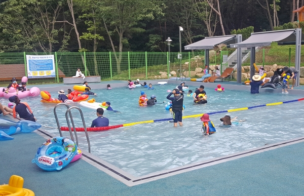 여름철 인기가 많은 토함산자연휴양림 야외 어린이 물놀이장은 깊이 0.5m~1.2m로 어린이들 뿐만 아니라 부모님도 함께 즐길 수 있는 공간이다.