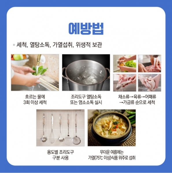 예방법은 채소류 식초에 5분 이상 담가두고 3번 이상 세척하기 냉장고 보관하기와 조리도구 육류, 채소, 생선 등 구분 사용하기 조리 전 흐르는 물에 30초 이상 손씻기 등이다.