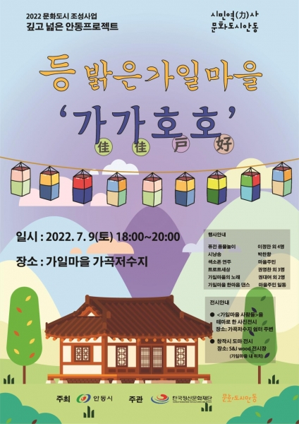 [금요저널] 시민역사문화도시 안동에서 문화도시 조성사업 ‘깊은 안동 프로젝트’의 하나인 ‘등 밝은 가일마을 가가호호’행사가 7월 9일 오후 6시 풍천면 가일마을 가곡저수지 일원에서 개최된다.