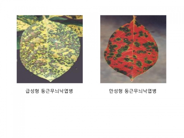 전형적인 둥근무늬낙엽병 보다 빨리 진행돼 푸른 상태로 낙엽이 되므로 약해로 혼돈하기 쉽다.