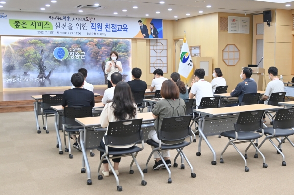 [금요저널] 청송군은 지난 7월 7일 군청 대회의실에서 코로나19 이후 2년 만에 전문강사를 초청해 종합민원과 직원 30여명을 대상으로 친절교육을 실시했다.