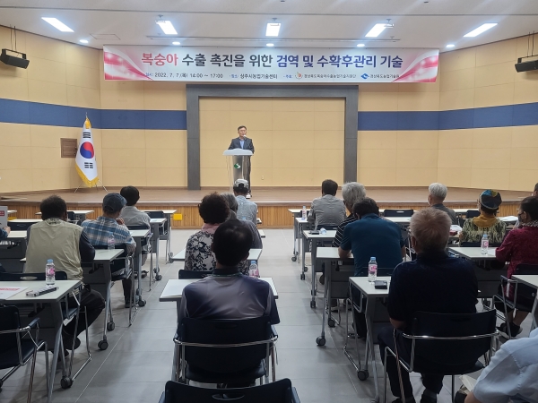 [금요저널] 경북도 농업기술원은 지난 7일 상주시농업기술센터에서 경북복숭아수출농업기술지원단과 함께‘복숭아 수출촉진을 위한 검역 및 수확후 관리기술 심포지엄’을 개최했다이날 경북복숭아수출농업기술지원단, 복숭아생산자협의회, 농촌진흥청, 시군 농업기술센터 관계관 등 100여명이 참석했다.