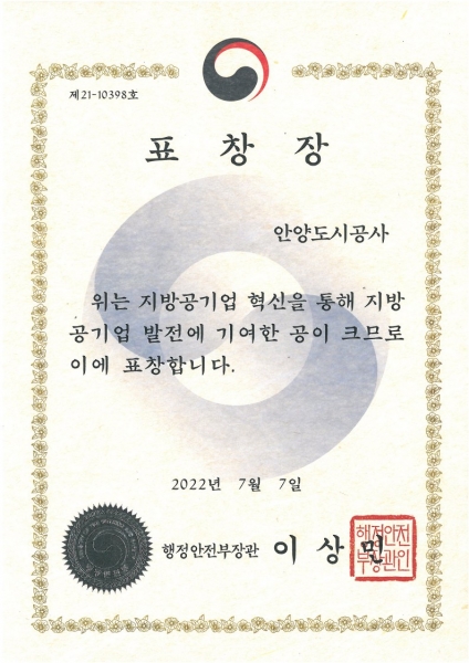 [금요저널] 안양도시공사는 지난 7일 지방공기업 발전 유공 기관으로 선정돼 행정안전부 장관 표창을 받았다고 밝혔다.