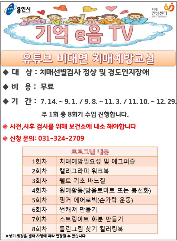[금요저널] 용인시는 오는 14일부터 유튜브채널 '기억ⓔ음 TV'을 통해 비대면 치매예방교육을 진행한다.