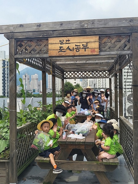 [금요저널] 무더운 여름날. 안양시 달안동 행정복지센터 옥상 텃밭에서 ‘어린 도시농부’들이 가지, 고추, 토마토, 상추 등을 수확하느라 작은 손길이 어설프고도 분주하게 움직인다.