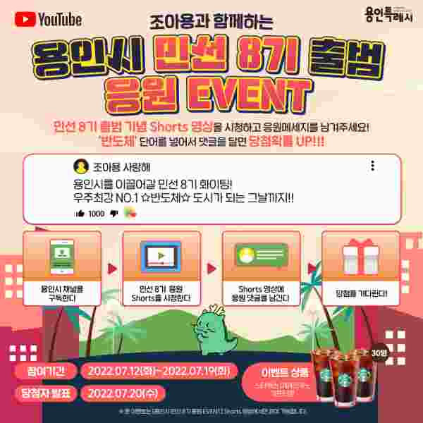 [금요저널] 무더운 여름, 용인시 유튜브 채널에서 귀여운 '조아용' 영상을 본 후 댓글을 달아 시원한 커피로 더위를 식히는 것은 어떨까?용인시는 민선 8기 출범을 맞아 오는 19일까지 채널 구독 후 민선 8기 응원 댓글을 작성한 30명을 추첨해 커피 모바일 상품권을 제공한다.