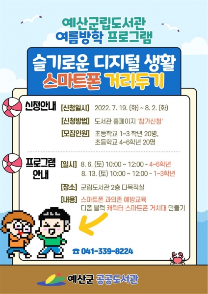 [금요저널] 예산군립도서관은 8월 6일과 13일 관내 초등학생을 대상으로 여름방학 프로그램인 스마트폰 과의존 예방교육, ‘슬기로운 디지털 생활, 스마트폰 거리두기’를 운영한다.