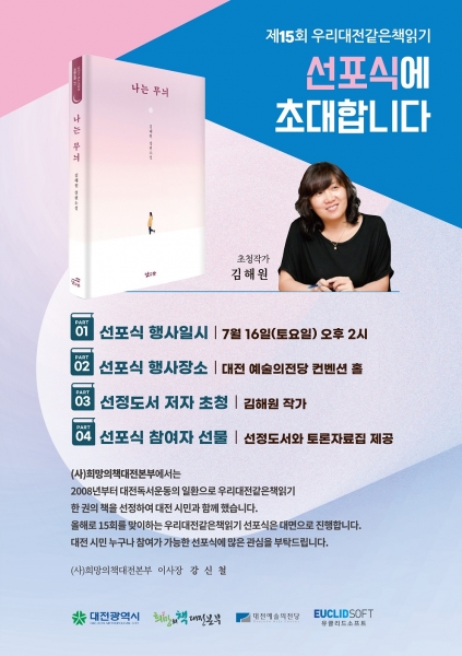 선정도서를 공식적으로 알리는 선포식은 16일 오후 2시 대전예술의전당 컨벤션홀에서 3년 만에 대면으로 진행되며 페이스북 희망의책 공식 그룹을 통해 생중계되며 관심있는 시민의 선포식 참여도 가능하다.