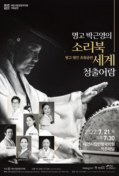 [금요저널] 대전시립연정국악원은 대전 국악의 위상을 높이고 있는 이 시대의 명고 박근영 선생을 초청해 2022 시즌 기획공연 ‘명고 박근영의 ‘소리북 세계, 청출어람’’을 7월 21일 19시30분 국악원 작은마당에서 개최한다고 밝혔다.