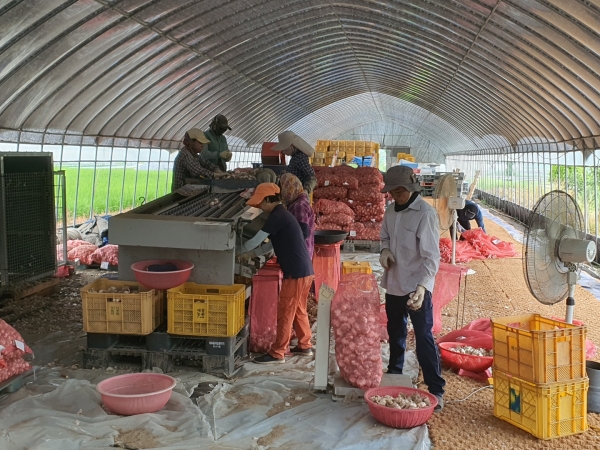 특히 미리 선별해 망에 담은 마늘이나 양파를 그대로 쌓아 비닐로 밀봉한 다음 송풍기 반대쪽을 개방해 공기를 흡입하는 건조하는 방식으로 강우 등 날씨에 영향을 받지 않고 균일하게 건조할 수 있어 품질 좋은 마늘을 생산할 수 있다.