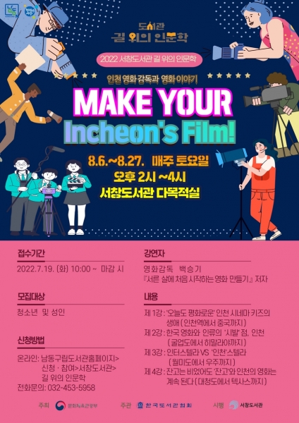 8월 영화 인문학 강연 ‘Make your Incheon’s film ‘은 ‘오늘도 평화로운’ 인천 시네마키즈의 생애: 인천역에서 중국까지 한국 영화와 인류의 ‘시발’점, 인천: 굴업도에서 히말라야까지 인터스텔라 & ‘인천’ 스텔라: 월미도에서 우주까지 잔고는 비었어도 ‘잔고’와 인천의 영화는 계속된다: 대청도에서 텍사스까지 등 모두 네 차례에 걸쳐 운영된다.