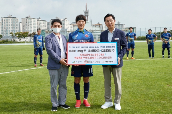 [금요저널] 희망을나누는사람들과 나눔과동행이 아산시 취약계층 지원을 위해 지난 16일 ‘일레븐FC&아산시청, 관내농협 축구동호회 친선 축구대회’에 참석해 1300만원 상당의 침대 7세트, 생활용품 꾸러미 36상자를 후원했다.