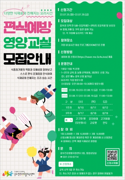 편식예방 영양교실은 기존 중부건강생활지원센터에서 운영하는 대면 프로그램과는 달리, 가정에서 온라인 화상회의 플랫폼인 줌을 활용한 비대면 프로그램으로 진행돼 누구나 편리하게 참여할 수 있다.